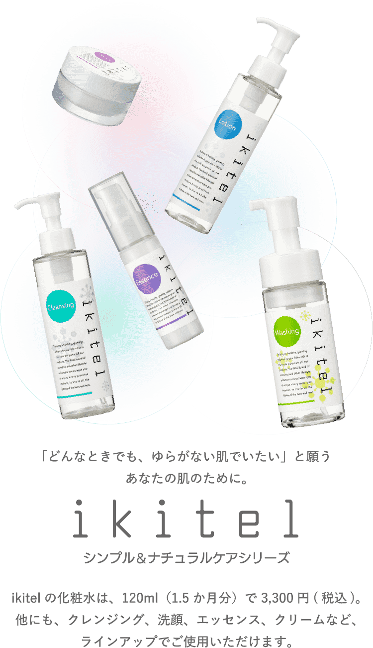 ヤクルトのikitel(イキテル)は、乳酸菌生まれの3つの 発酵うるおい成分配合※1で、ゆらぎたくないあなたの肌を、うるおいに満ちた、なめらかな素肌へと導きます。